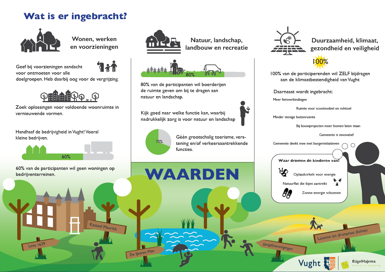 Inwoners, ondernemers en organisaties konden reageren op 14 stellingen op de website WijinVught. De stellingen gingen over uiteenlopende onderwerpen, zoals woningbouw, openbare ruimte en het buitengebied. Er is ook aangegeven welke waarden en karakteristieken belangrijk worden gevonden. Bewoners, ondernemers, organisaties en andere belanghebbenden hebben bij de voorbereiding van de omgevingsvisie waarden en karakteristieken meegegeven. Deze zijn hierin meegenomen. Tijdens de inspiratieavonden spraken we met de deelnemers over dezelfde stellingen. In totaal hebben bijna 100 mensen de website WijinVught of de inspiratieavonden bezocht.