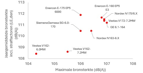 de geluidsnorm van de windturbines ter plaatse van gevoelige objecten bedraagt maximaal 47 dB Lden en 41 dB Lnight;